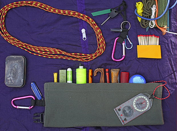 Pinned to a wall is Utility Cloak, a giant cape decorated with a litany of pockets filled with camping equipment, books, fire-starting tools and fantasy survival gadgets.