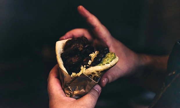 Fair warning: these are not well-behaved wraps. They will reduce you to hunkering over the box, crab-like, mushing the sensational fillings into your trap. Give in to it, it’s easier.