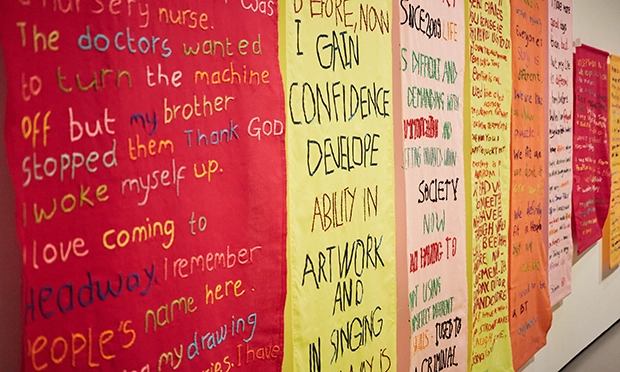 Personal accounts of brain injury have also been embroidered into banners, and guests can also listen to podcasts featuring survivors’ stories in their own words.