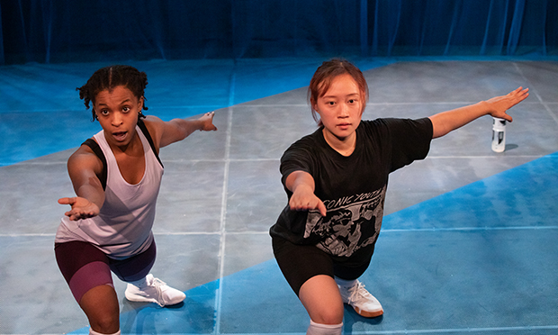 Ingrid Hu’s blue curtains leave the space refreshingly clear, relying on the fencing costumes and Marty Langthorne’s transportive lights to focus the action. Metamorphic light is certainly needed as the play is set almost entirely in a fencing club and is pretty dialogue-heavy.