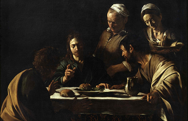 You could compare it with Caravaggio’s Supper at Emmaus, 1606, where Jesus and his companions are eating at an inn, with the same carefully laid table, an elegant carafe of wine and good bread, a bowl of fruit and what looks like a pot-roast guinea fowl.