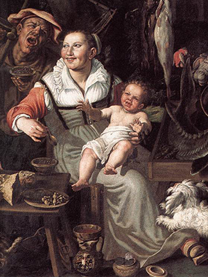 The joys and hazards of beans are all too obvious, as a cheerfully vulgar couple feed themselves and a howling infant with a bowl of beans, the inevitable flatulence and incontinence emphasised in the child’s unprotected bottom, and the man’s raucous behaviour.