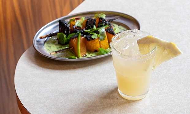 Spring homemade kimchi, a Barbie pink that will blow your eyelashes off, and tasty bread, a burnt chargrilled naan interpretation, are great partners. Pair these with a bigroni, a negroni made with fernet-branco, making it more lurid, deeper and altogether even more grown up, or a crisp gimlet. Both are under £10 (yay) but served in tiny water glasses (boo).