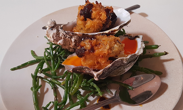 Sometimes it feels like fried oysters are a way of getting rid of all that troublesome oysteryness – the essence of the thing that nonetheless puts some people off – but these ones wear their barbecue sauce and crisp batter well, and are paired with plump, salty samphire.