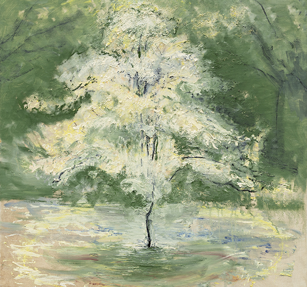 For within such cycles there is also life and renewal. In particular, Hawthorn Blossom Tree, 2019, and Shoreline, 2015-2016, use light and brightness of colour to wonderfully enlivening effect.