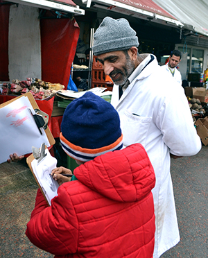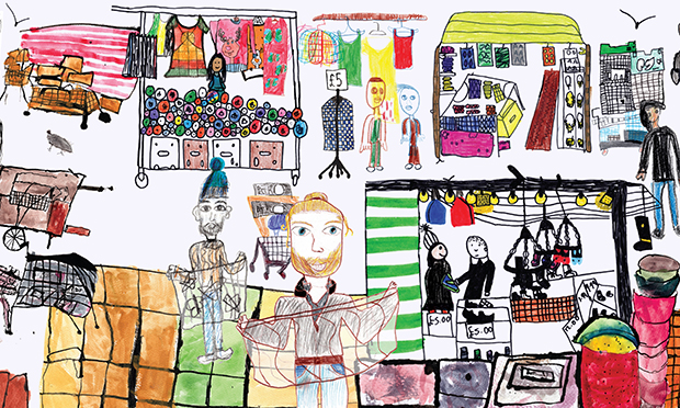 Clapton-based illustrator Sion Ap Tomos spent five days with the kids at the market and in the classroom, where they mocked-up stalls and studied historic photographs of Ridley Road.