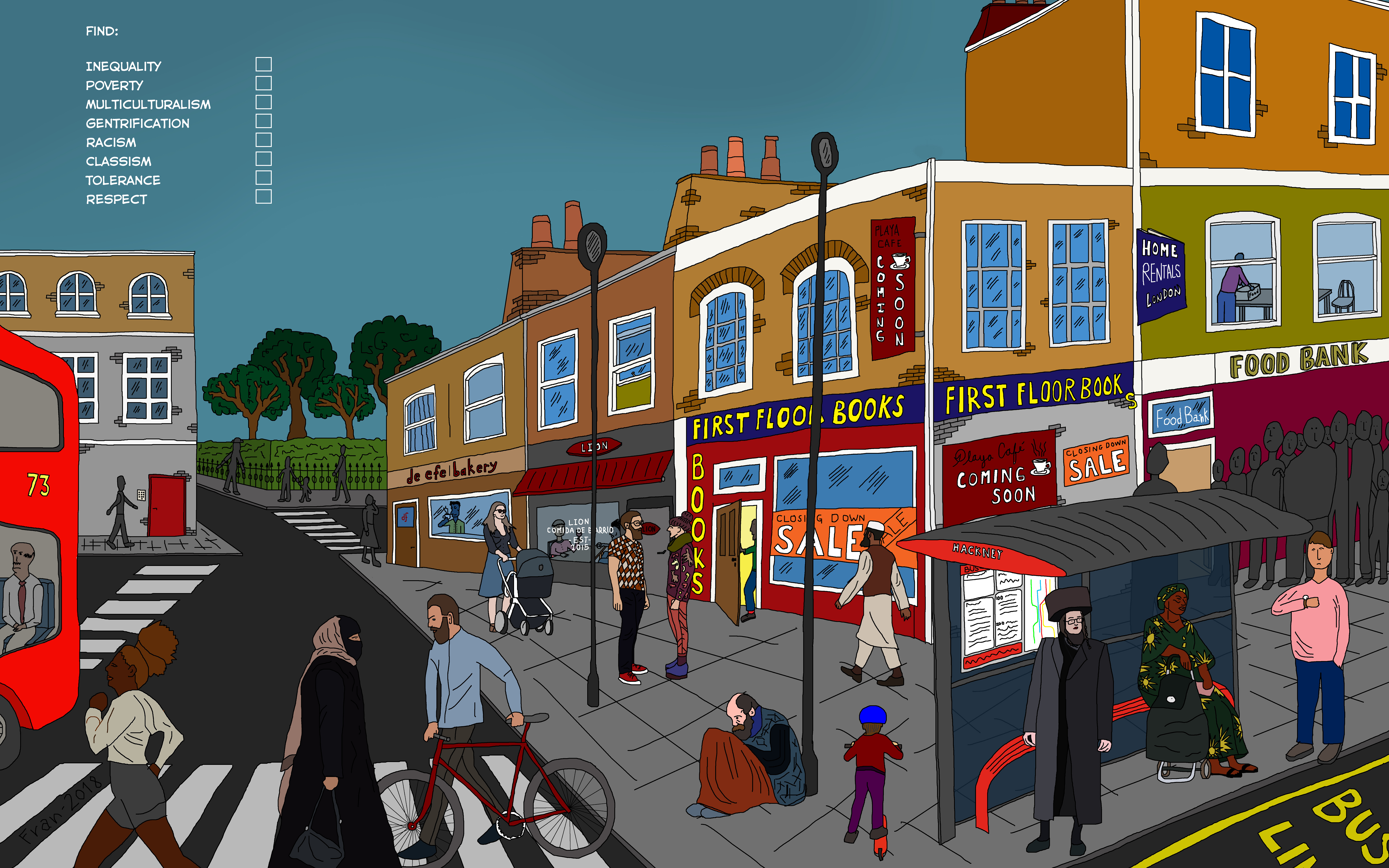 Our comic artist Francisco de la Mora this month asks readers to put their thinking caps on for his nod to Where’s Wally?-style games – this time with a Hackney twist.