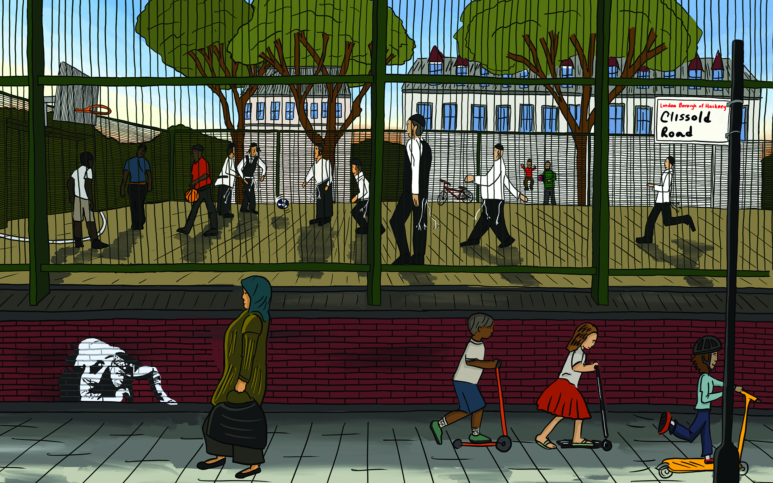 Illustrator Francisco de la Mora celebrates Hackney’s multiculturalism in this snapshot of a ball game in Clissold Park.