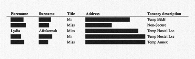 Four weeks after that, a separate upload published contact details for council estate tenants who had requested repairs to boilers, buzzers, and broken doors.