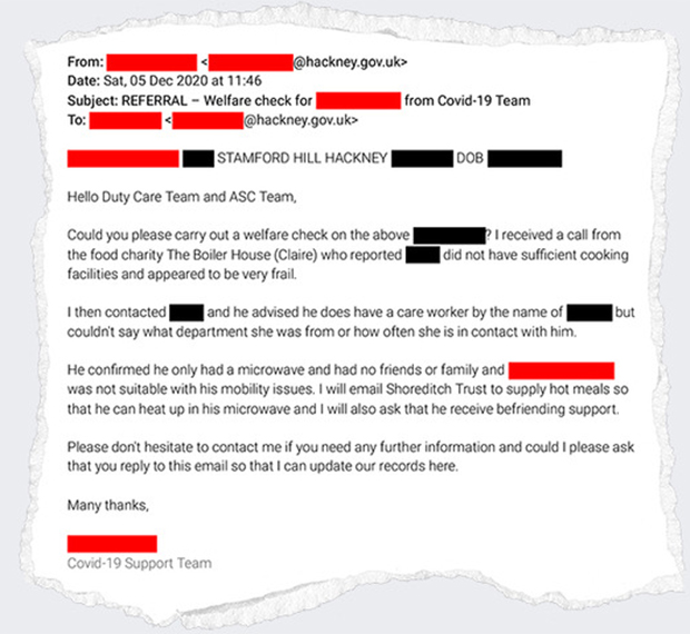 The blatant disregard for residents’ dignity and personal privacy was summed up on a board set up to streamline the council’s Covid-19 helpline – when a ‘service designer’ illustrated a complaint about line breaks in case notes by sharing a harrowing report from a support worker in Stamford Hill.