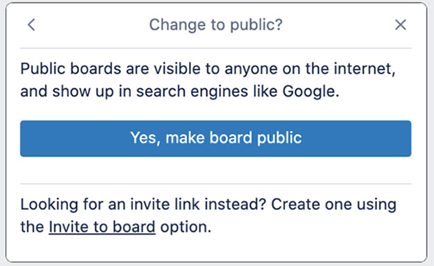 When setting up a board, administrators are invited to pick from three privacy settings – ‘private’, which makes boards invite-only, ‘workspace’, which limits access to members of their organisation, and ‘public’, which allows anyone on the internet to see.