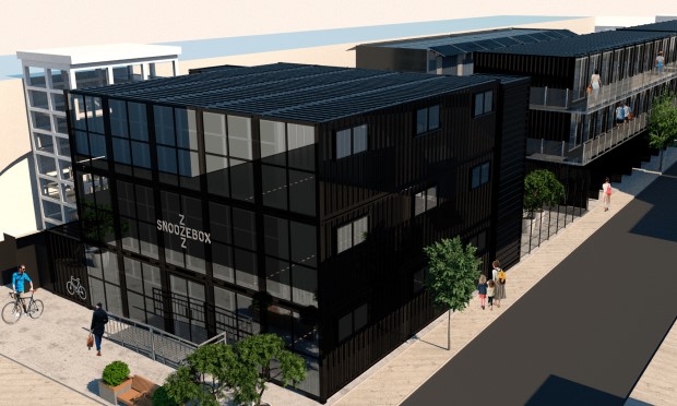The new Snoozebox development, a scheme aimed at “millennials, cost conscious business professionals and tourists”, will be constructed of prefabricated containers with an outdoor terrace, with each hotel room able to hold up to two adults and a child with an en-suite wet room.