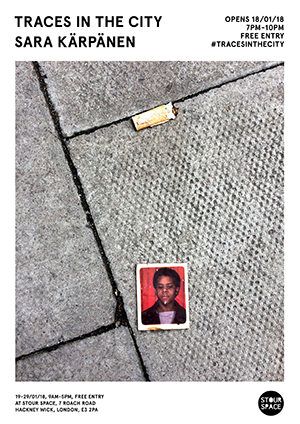 Sara Kärpänen is a Finnish-born writer (mostly poetry and pieces for ‘guide to the mindful life’, Elephant Journal), curator and artist, now based in East London. Her first two roles call for a keen eye on the city, and her latest exhibition at Hackney Wick’s Stour Space applies that skill to her artistic practice as well. Adept with paint and pencil and a creator of imaginative maps, this is her first exhibition fully comprising photography. And you can’t fault the title for accuracy – from empty condom wrappers and drug baggies to lost toys and weathered passport photos, her images from Dalston and Hackney’s pavements summon up myriad narratives in the mind of the viewer. These are interspersed with some of Kärpänen’s typed poems, which offer pleas for the human connection that she searches for in the litter and detritus of the streets. From 19 January to 29 January, opening evening 18 January