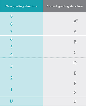 The numbers and letters are not directly comparable, but a 9 is the equivalent of an A*, and a 1 is effectively a G.
