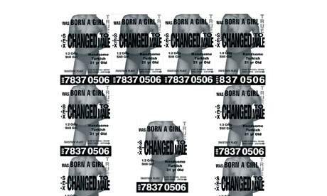 Among the calling cards is a photograph of a male torso with the text: “Was born a girl. Sex changed to male. ½ only still girl. Handsome Turkish 21 yr old”. The artists have arranged 13 repeated images of it, above, in what they say is a reference to a Victorian clergyman disgraced as a paedophile.