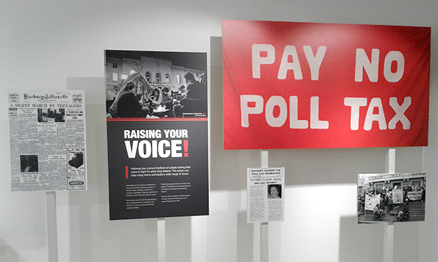 Among the items on display are a copy of the Humble Petition for women’s suffrage from over 100 years ago, a photograph of poll tax protestors outside the Town Hall in 1990, and anti-National Front leaflets from the early 90s.