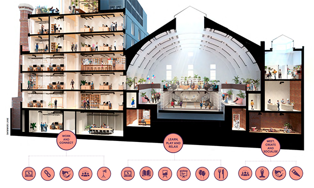 Its proposals include event space, studios, and workspace “available at an hourly rate to building users and the local community”.