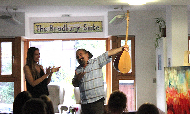 Over a dessert course green tea and baklava, the assembled diners crowded round for the night’s entertainment and Ibrahim’s big moment: an assured performance of a couple of atmospheric tunes on traditional instrument the Saz, accompanied by a Headway staffer rocking a drum. Then, time for more conversation, friendly joshing and a raucous curtain call of appreciation for the chefs and ad hoc kitchen staff.