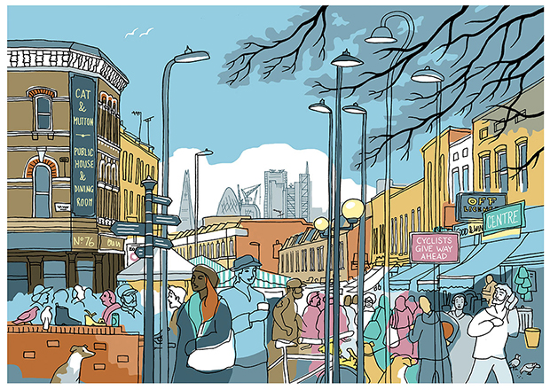Many of the works will be instantly recognisable, because the artist chosen for the display is Hackney resident Jane Smith, whose creations feature the familiar canals, markets and landmarks of the borough.
