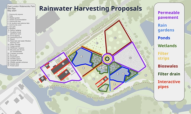 Rainwater harvesting features heavily in the proposals – permeable pavements and filter drains are just a couple of the solutions included.