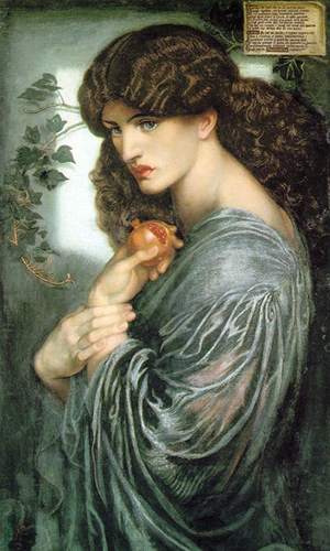 Dante Gabriel Rossetti painted William Morris’s wife Jane as Prosperine holding the fatal pomegranate, and gazing mournfully at the receding summer light, an archetypal image of sorrow and voluptuousness.