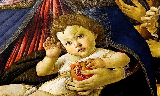 Many a Florentine housewife in the 1480s must have shuddered in despair at Botticelli’s somewhat detached take on child care, with the infant’s unprotected bum dumped on his mother’s blue silk gown, while the indelible stains of pomegranate juice threaten his white smock.