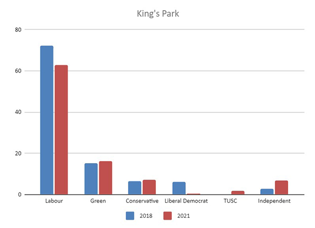 The Liberal Democrats, by contrast, will struggle to find solace in these results. Their six per cent 2018 vote share in King’s Park was reduced to a meagre 0.3 per cent by the candidacy of former Lib Dem Ben Mathis, who garnered 4.8 per cent standing as an independent. Across the four wards, the party’s average vote share of six per cent in 2018 slumped to 4.2 per cent in 2021, suggesting that they have a lot of work to do to win back any of the seats they have previously held in the borough.