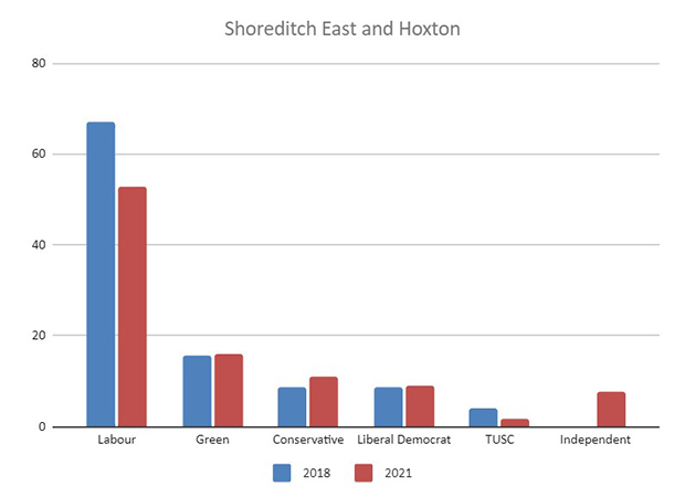 The aspect of the results that stands out most is the lack of any major shift, despite the massive upheavals in the political scene occasioned by Brexit, Covid, the replacement of national-level leaders of most of the parties contesting elections in Hackney, and the changing focus of borough politics.