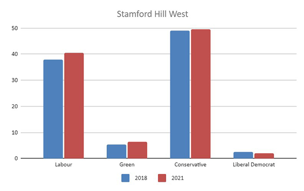 Labour held Hoxton East & Shoreditch, King’s Park and Woodberry Down, while the Conservatives retained Stamford Hill West. In each case the party that held the seat suffered a minor loss in vote share, but not enough to threaten its strong majority.