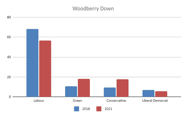 Indeed, the Greens – long the second-polling party in Hackney at ward level – had good by-elections, seeing their vote share rise from an average of 11.7 per cent to 14.1 per cent across the four areas. This is in line with the party’s strong nation-wide performance this year, though not as dramatic as in places like Bristol or Sheffield where the party dramatically increased its seat share.