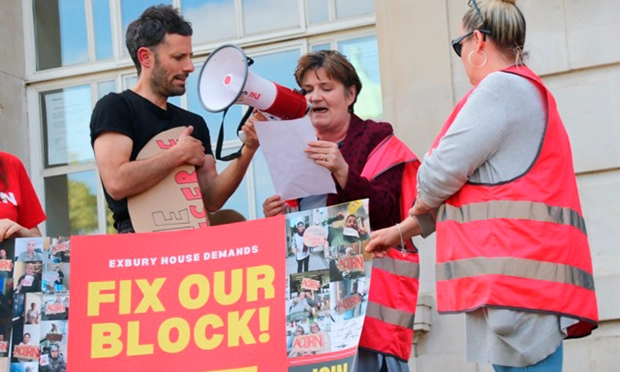 Twenty people from Exbury House, part of the Frampton Park Estate, held up placards that read ‘Fix our block’ and ‘Hackney Council, shame on you’.