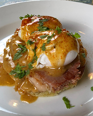 My brunch-bosom-pal goes straight for what I am told is a must-have: Scolt Benedict, with a wedge of ham so thick you could use it as a doorstop, perfectly poached eggs, and a smokey hollandaise sauce, on brioche toast.
