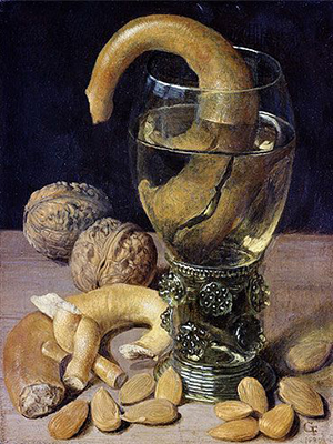 Another painting by the same artist deploys the bread and wine theme with a dramatic sight of a pretzel dunked in a glass of wine, along with some walnuts.