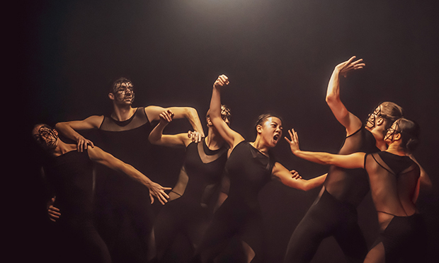 Into black we are plunged, and a floating strip of light illuminates six dancers in netting leotards and web-like masks created by artist Ana Rajcevic. They all start to nod in unison with Rival Console’s industrial techno-esque score. Such a simple start, and so very effective. The piece progresses from there, but the same sci-fi feel continues throughout.