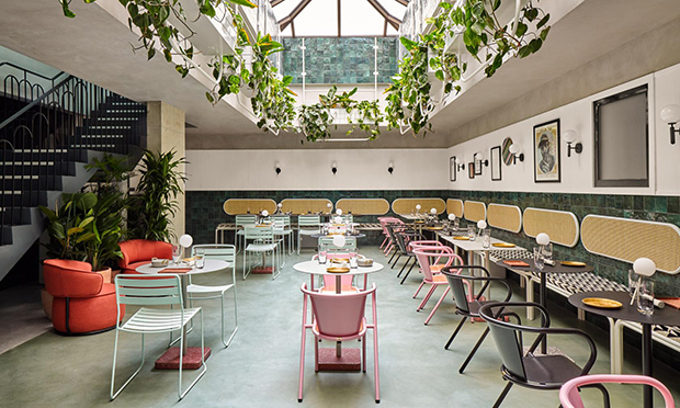 Below is a mock courtyard with pink flying whale lights, matching the spray-painted pink iron chairs. Real plants unfurl from window boxes, and jagged patterns predominate in a pop-art take that is on trend if a little unoriginal.