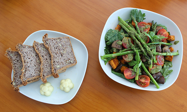 We start with a pesto salad packed with roast asparagus, sweet potatoes, mushrooms, cherry tomatoes and a side of buckwheat bread with vegan butter.