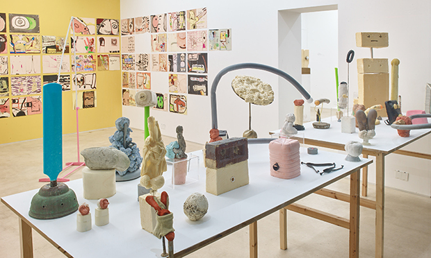 The sculptures displayed here are concocted from objects English has picked up walking around London, moulded together with blue-tack and foam.