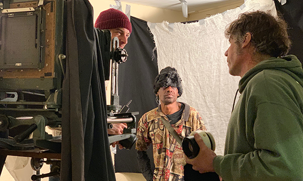 In a small stall, they are taking portraits of people coming in from the street, and in a room taped off with black fabric, the team has set up a dark room where they develop the photographs.