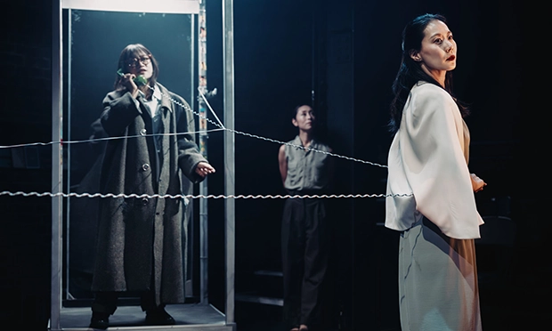 Shizuka Hariu’s set is versatile and modernist. An illuminated, partly mirrored phone box – a theme throughout the writer’s work – glows and spins on tiny wheels.