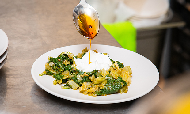Braised Swiss chard crowned with a hot and sour dressing and a dollop of chilli yogurt is a similarly sunny affair. The green of the chard’s juices, separating from the dressing, and the bright white of yogurt have an almost sexual effect. Who am I kidding? Definitely sexual.