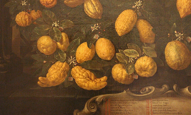 The Medici family continued their enthusiasm for botany and horticulture, and commissioned Bartolomeo Bimbi, who as a young painter must have known Garzoni’s work, to do huge group portraits of the fruit cultivated in their dukedom. It took four canvases to record all the citrus fruit in their collection. Some of these are familiar to us, like the Etrog valued by our Jewish communities for its perfection and symbolism in fertility ceremonies.