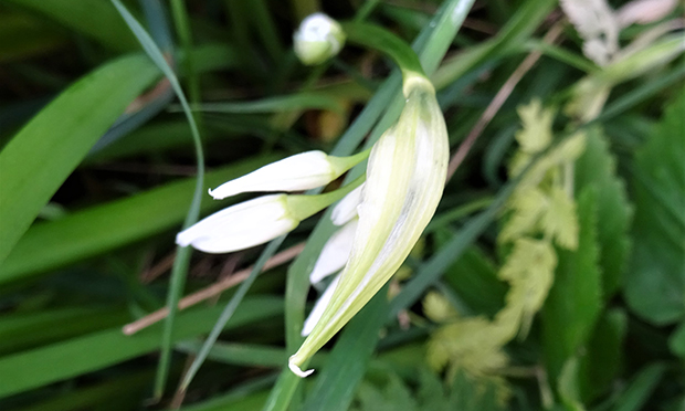 Three-cornered leek is a wild bulb plant and, due to the unseasonably warm Autumn weather, bulbs which would otherwise be quietly slumbering below ground, have thrust upwards. While this early awakening does not negatively impact the plants (the foliage will die back when the weather cools and the plant will reappear in Spring as normal), it does mean that they have revealed their hiding places. So while the soil is loose, such as it is at this time of year, now is the perfect time to remove them.