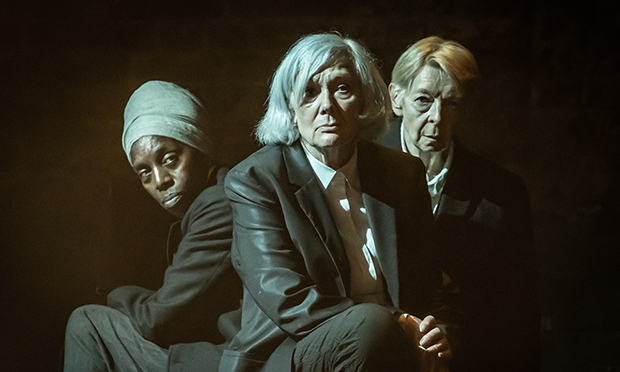The wyrd sisters, played by Maureen Hibbert, Diane Fletcher, and Valerie Lilley, avoid any cringe-worthy spookiness. Cool and collected in dark suits, and shocks of white hair or headscarves, they watch the action seated behind the audience, but invest themselves physically at points. More active agents than just harbingers of doom. This is an interesting twist, moving away from the tropes of 16th-century witch hunts and giving a more Hellenistic approach (the Fates).